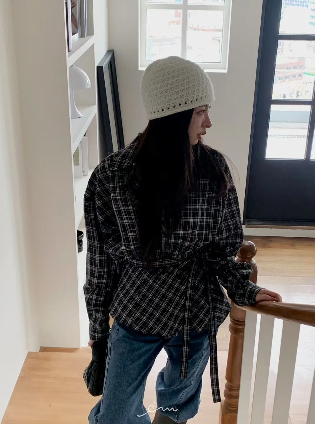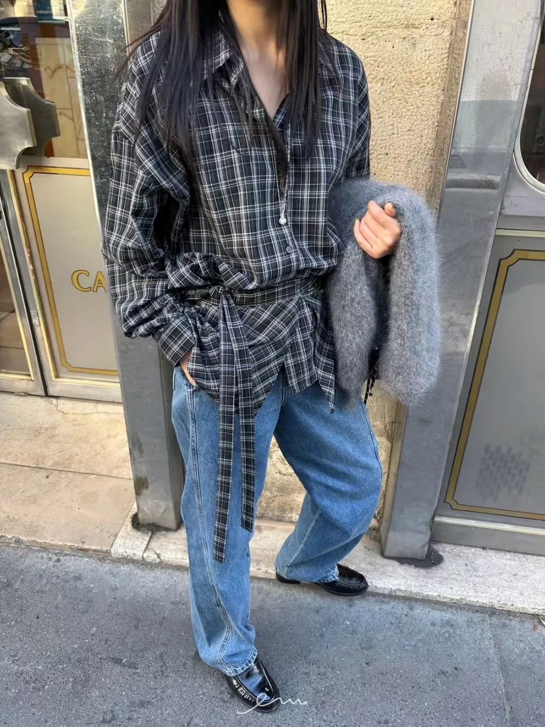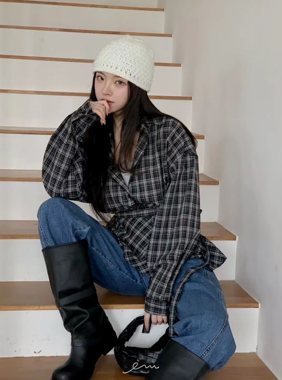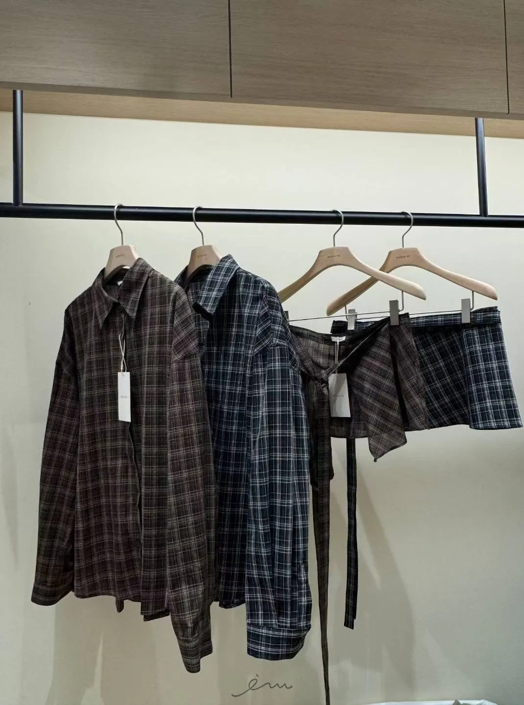 MON綁腰屁簾+格紋襯衫