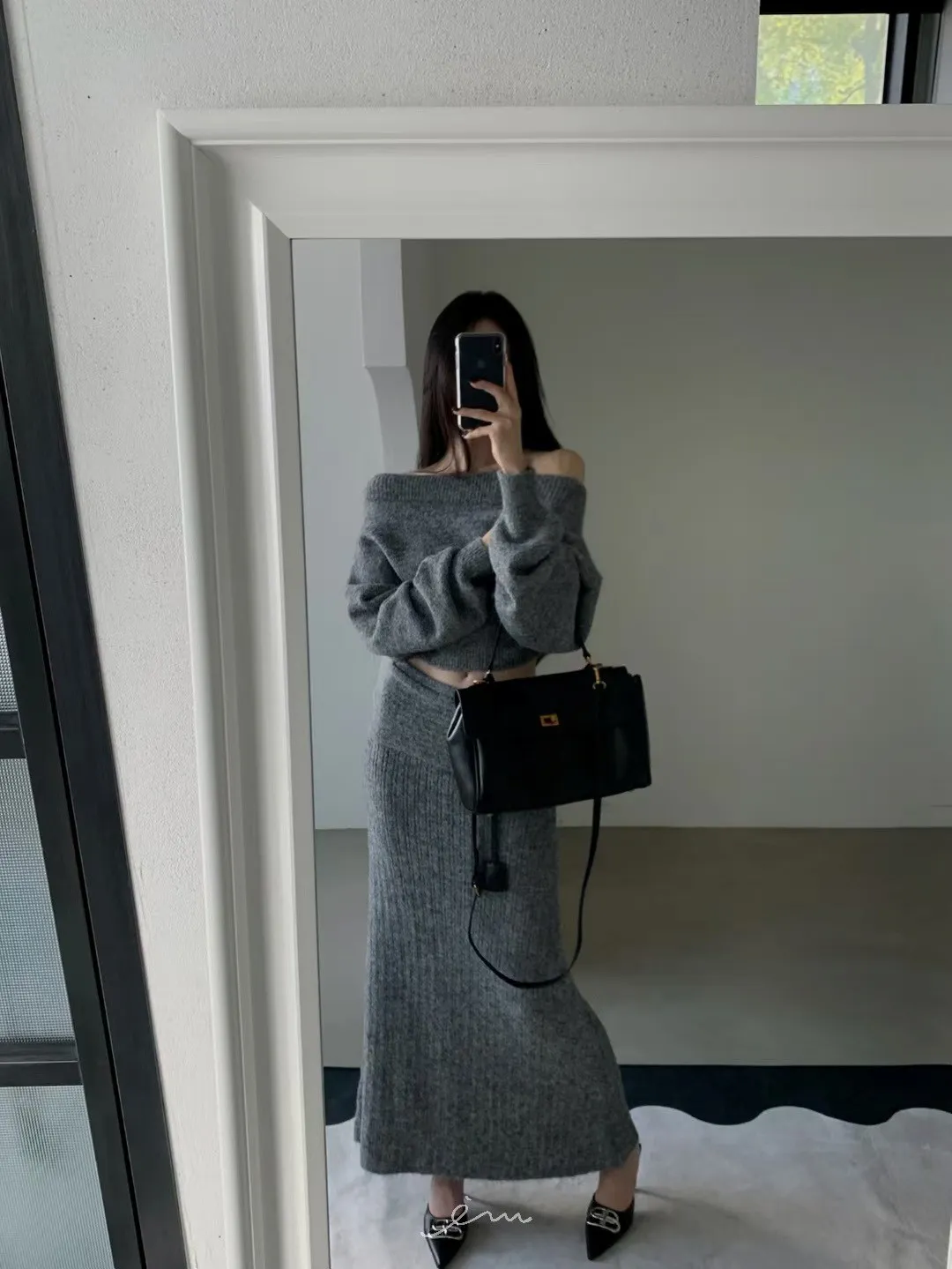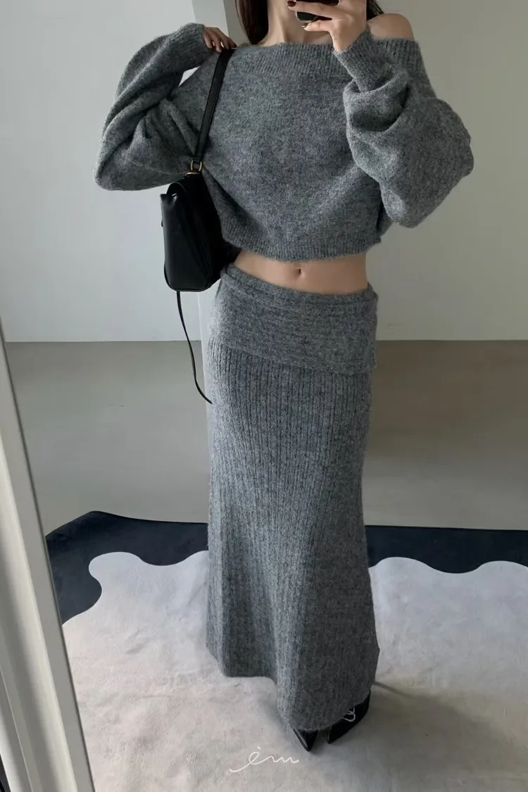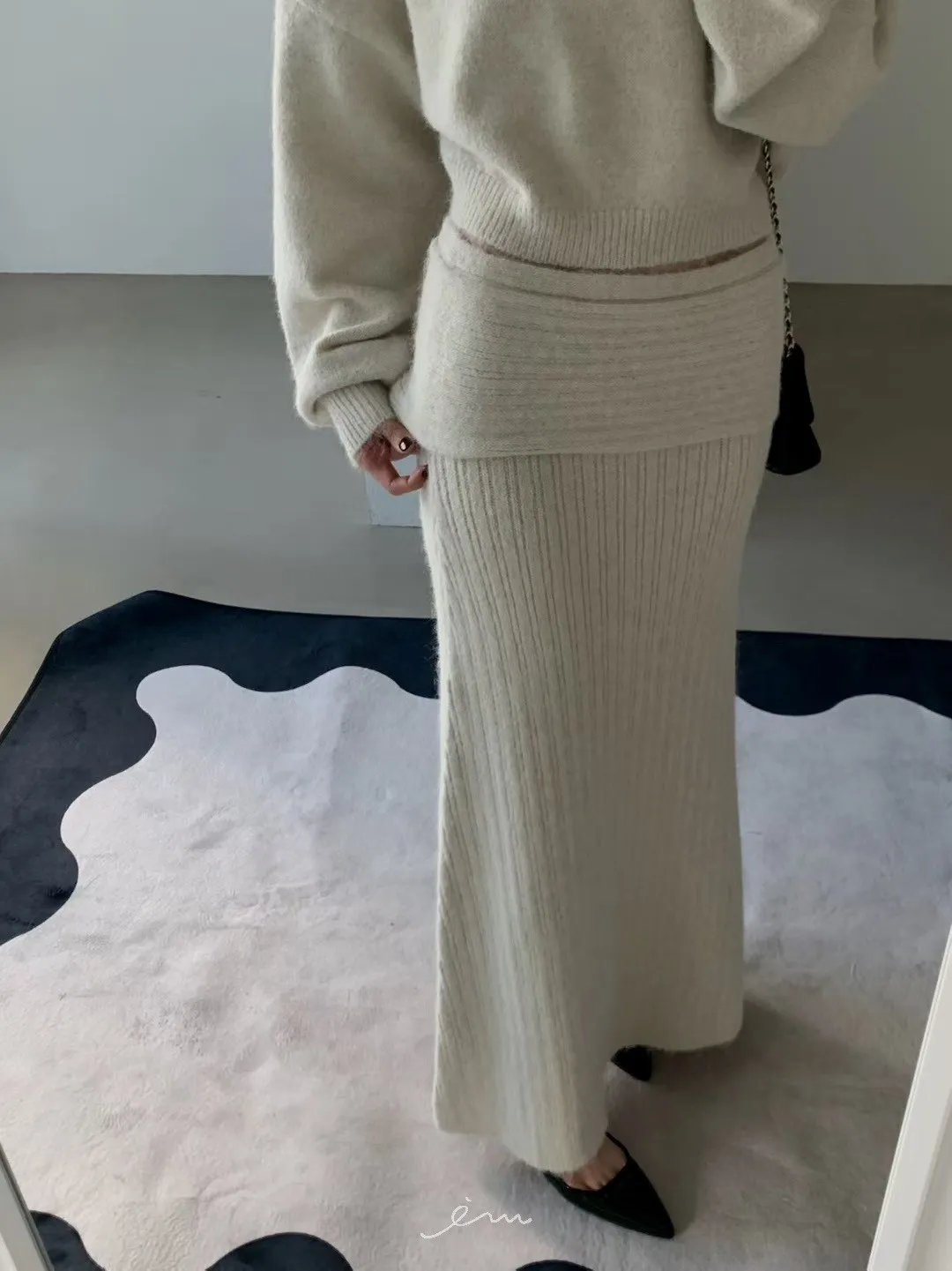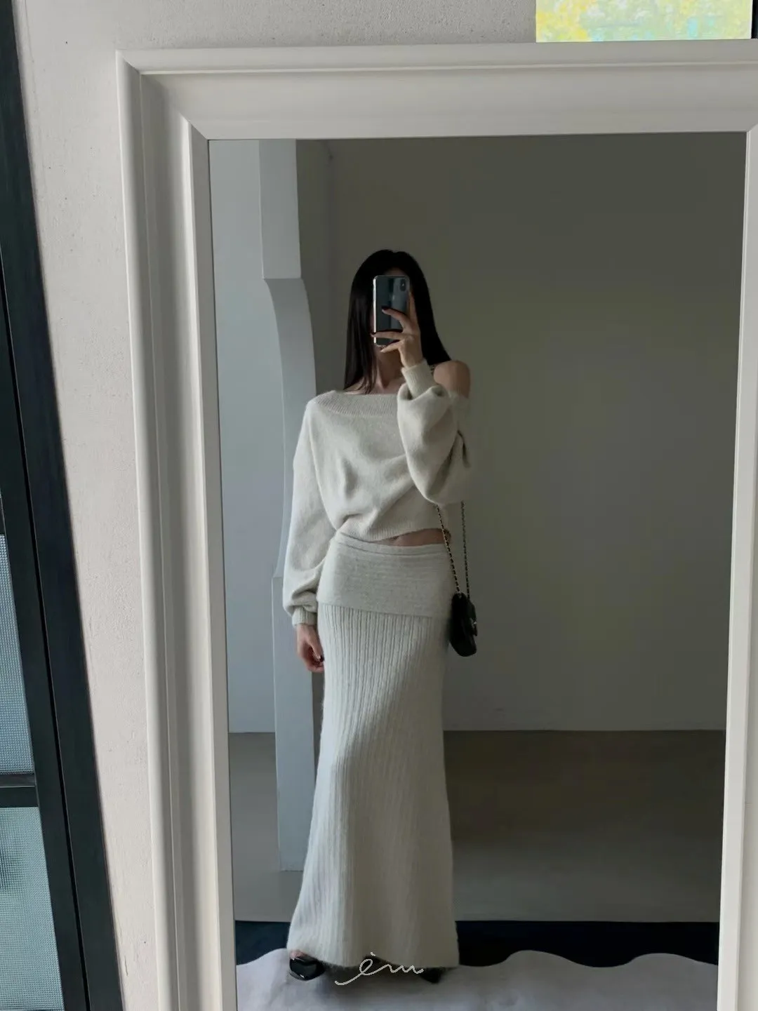 VE馬海毛斜肩上衣+反摺感長裙(套裝)