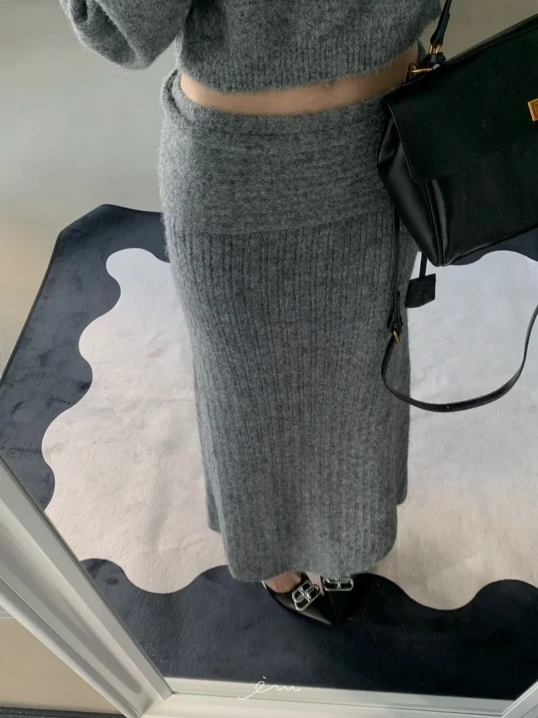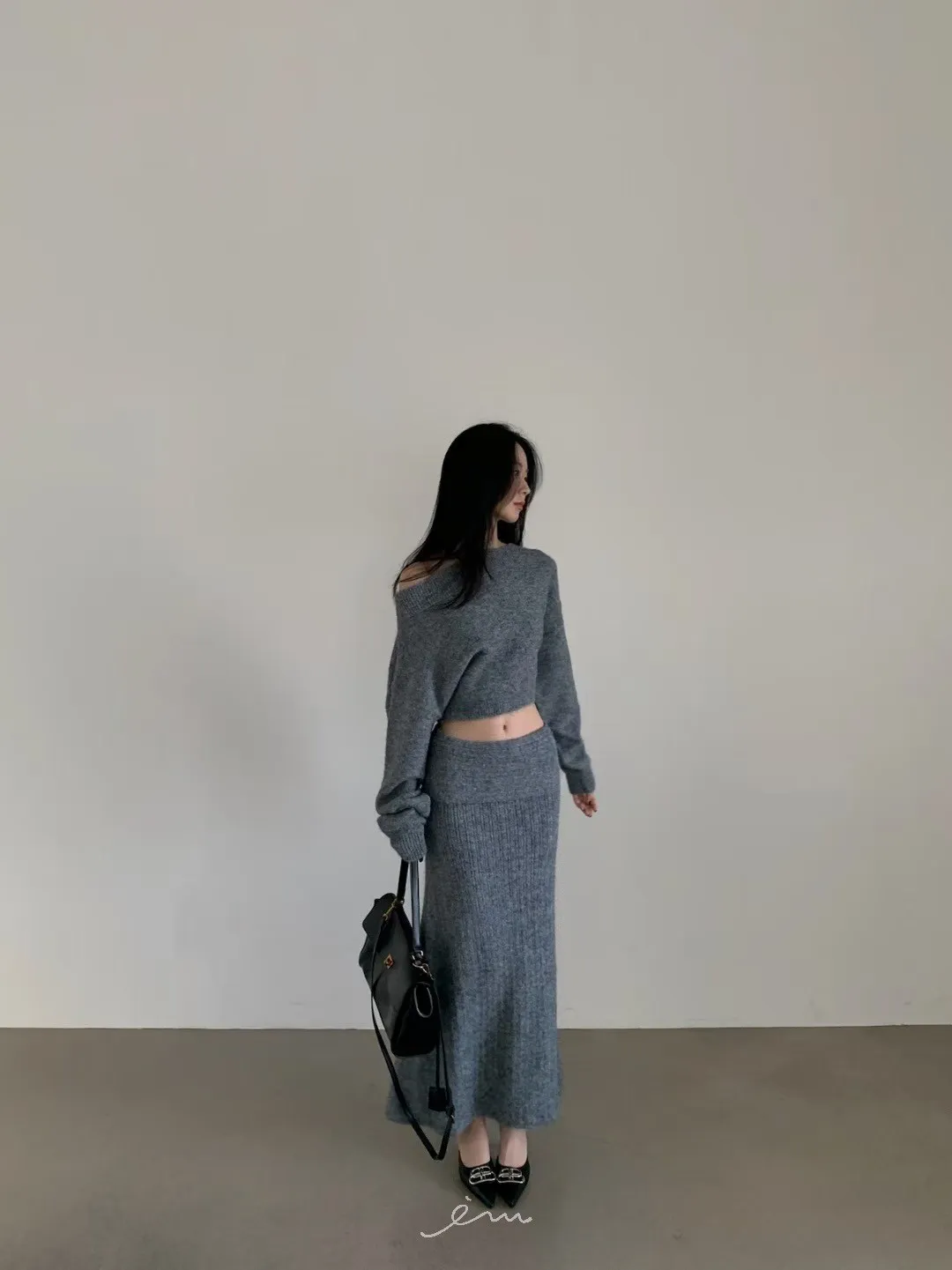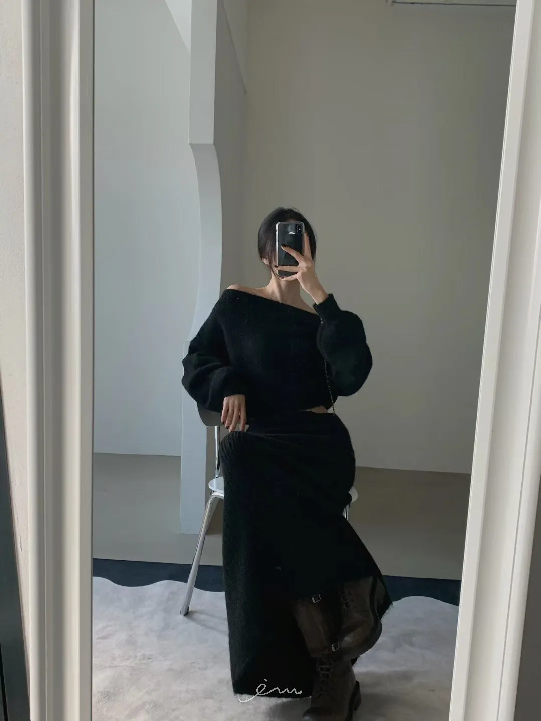 VE馬海毛斜肩上衣+反摺感長裙(套裝)