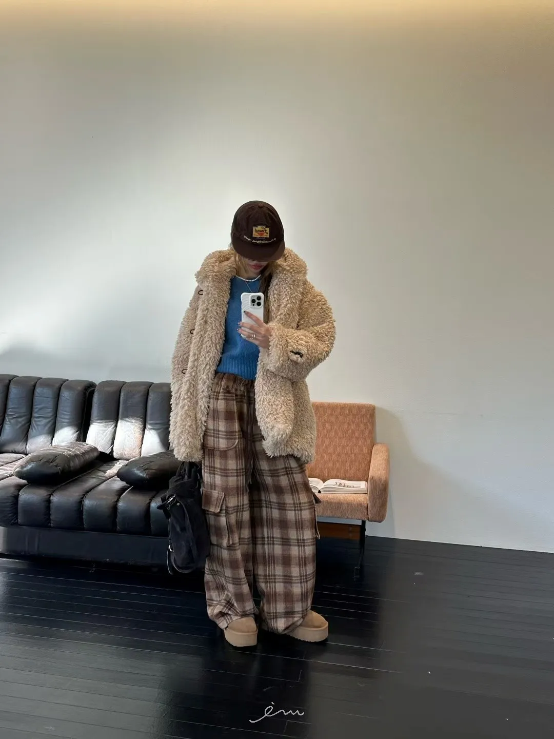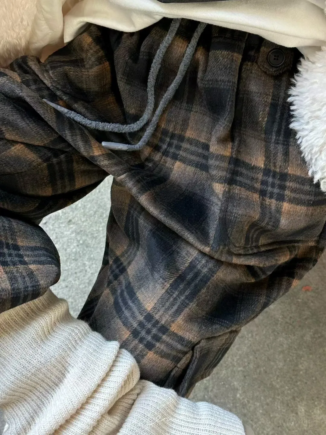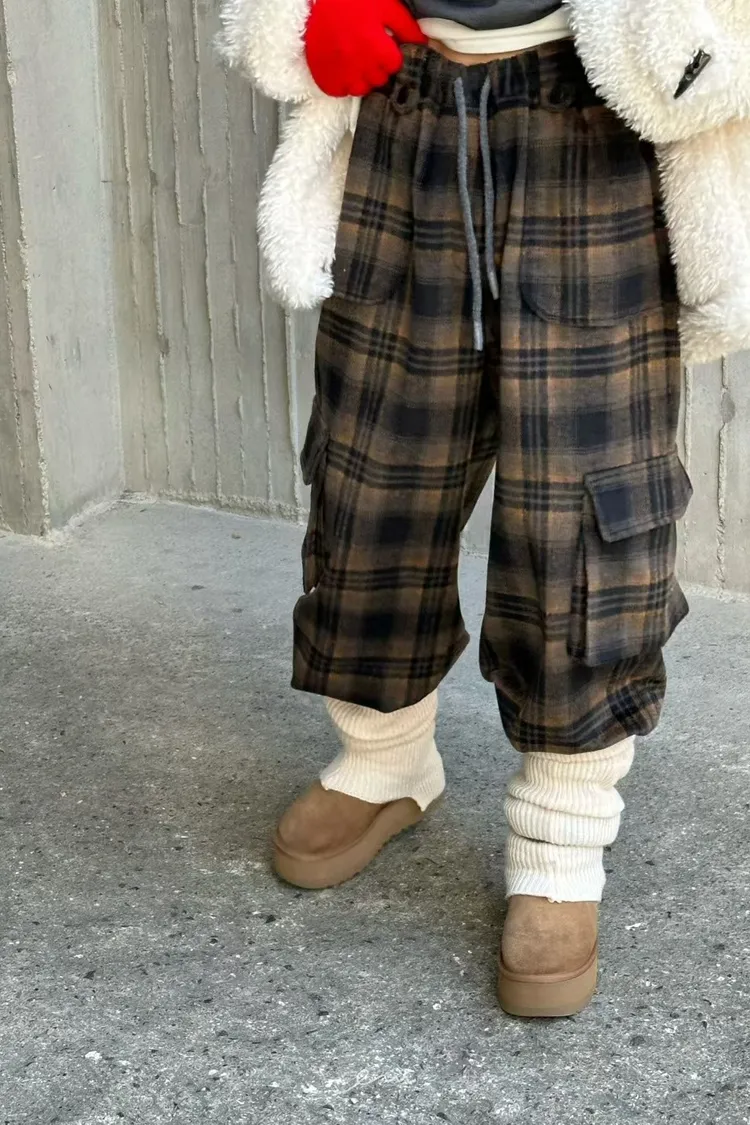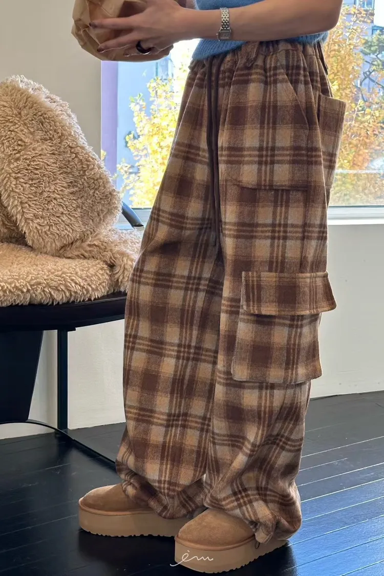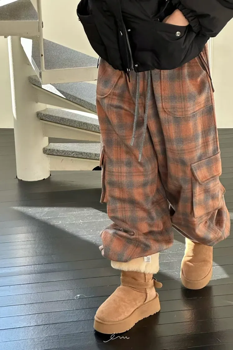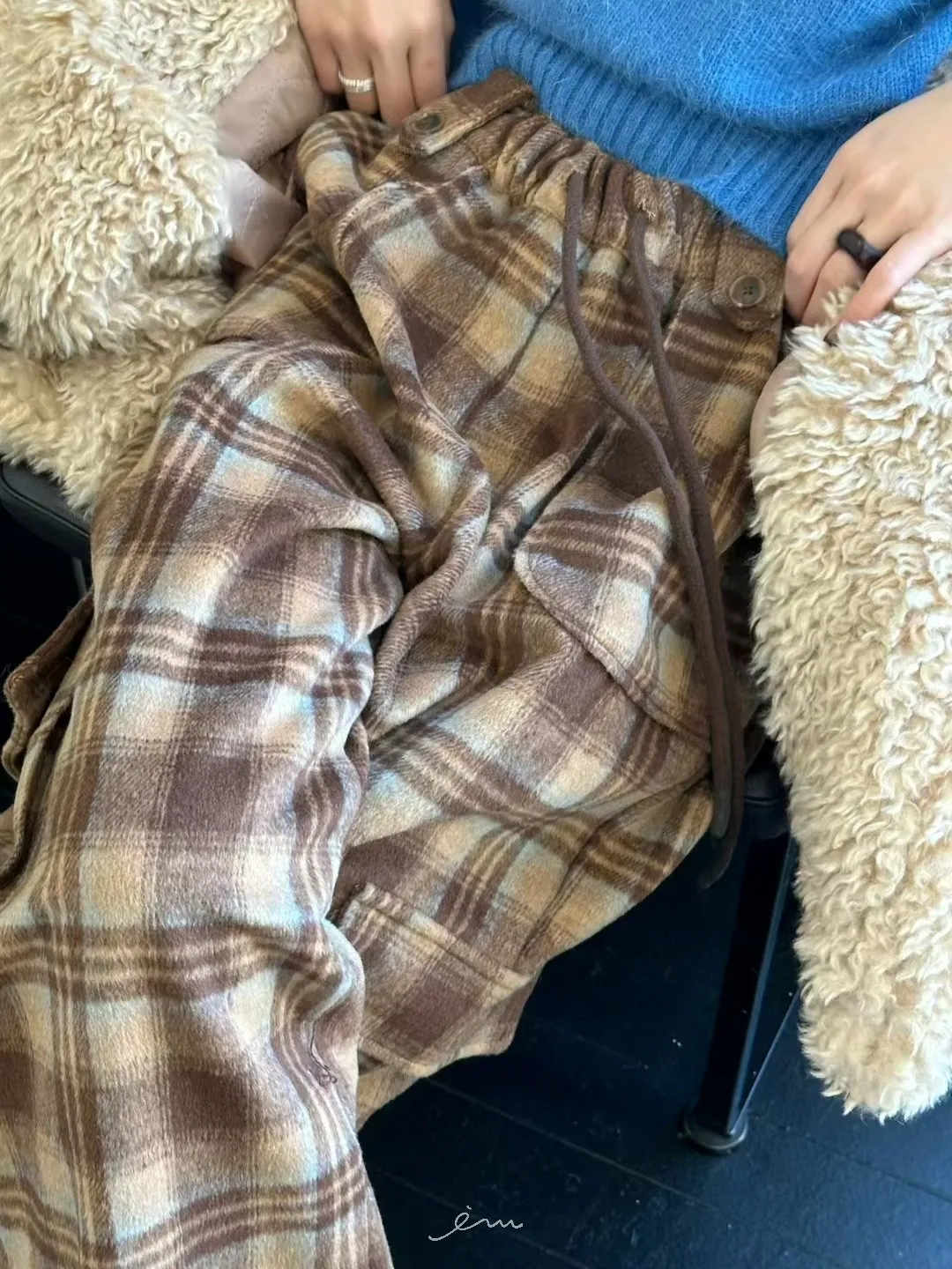 ZERO羊毛褲頭鈕釦抽繩格紋長褲(羊毛)