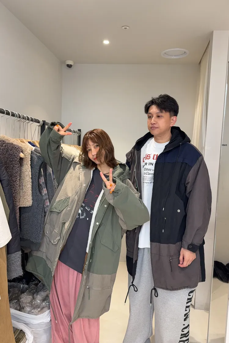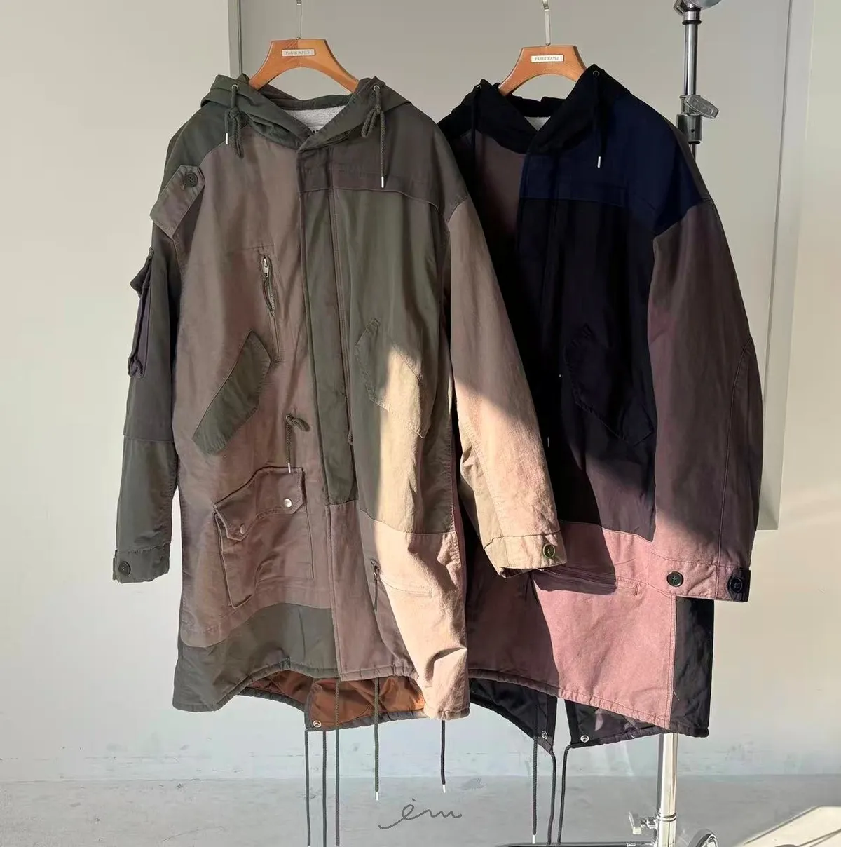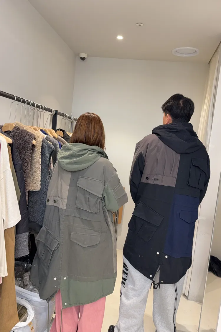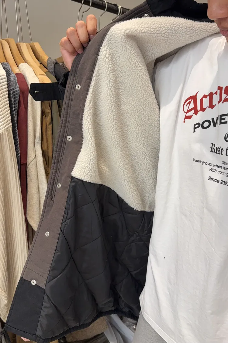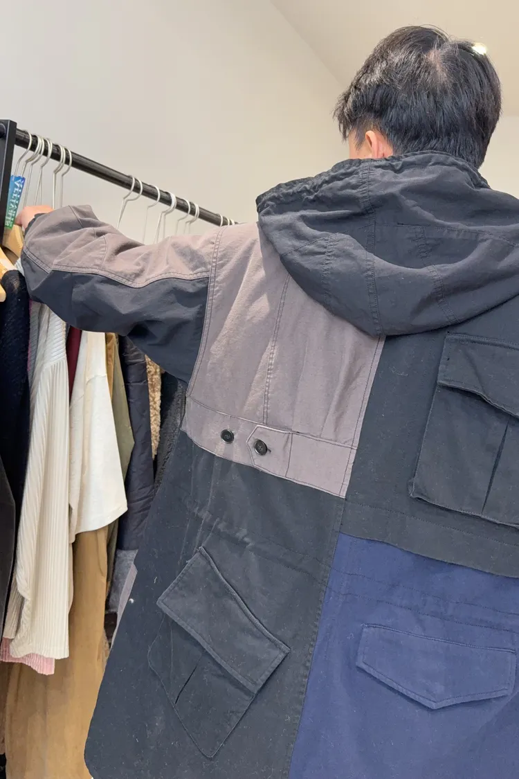 PA很多拼色口袋內羔羊毛連帽長板外套
