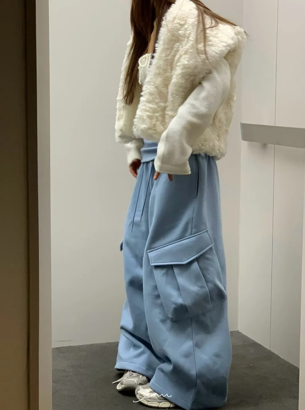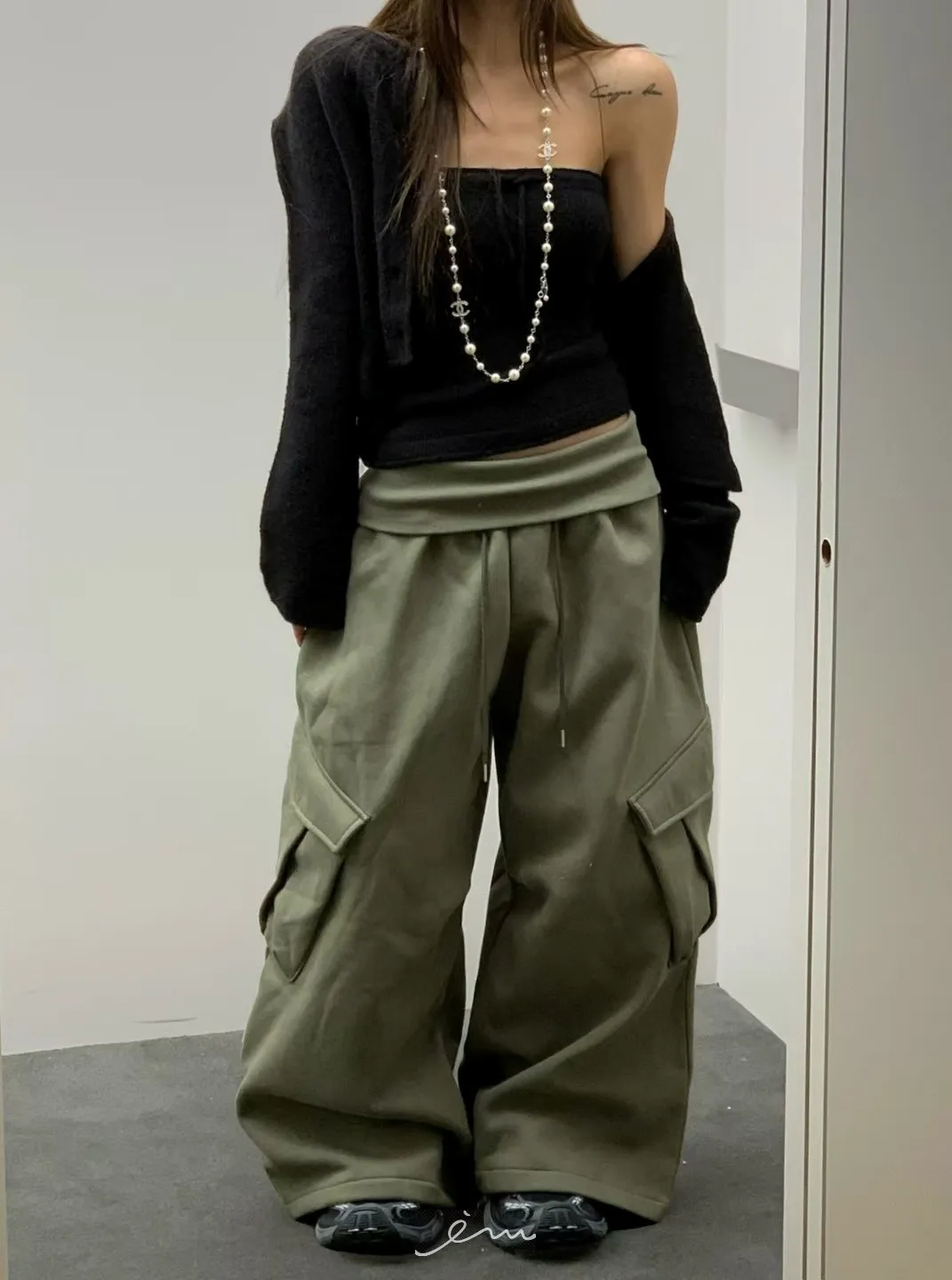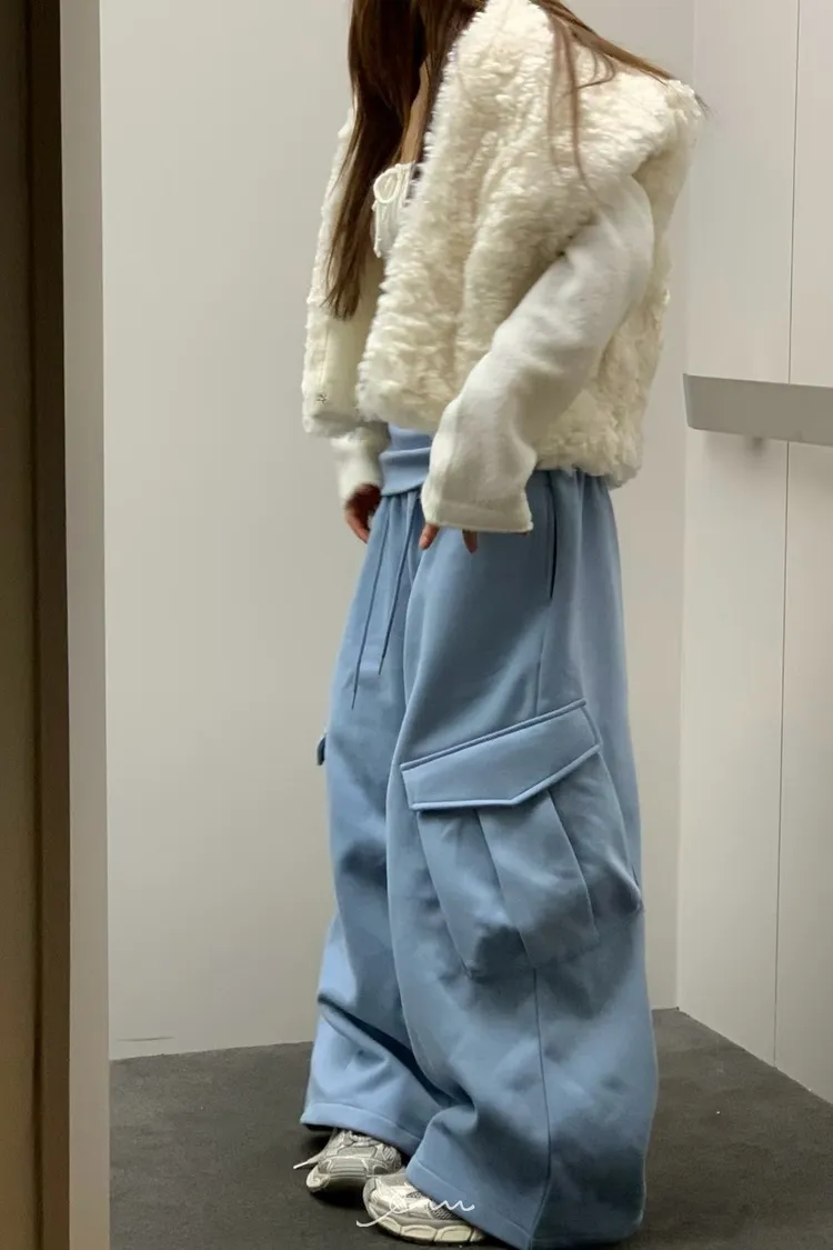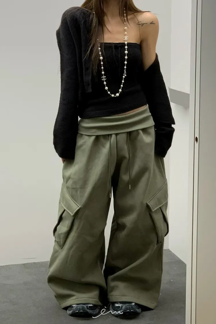 VK褲頭反折立體口袋刷毛寬褲