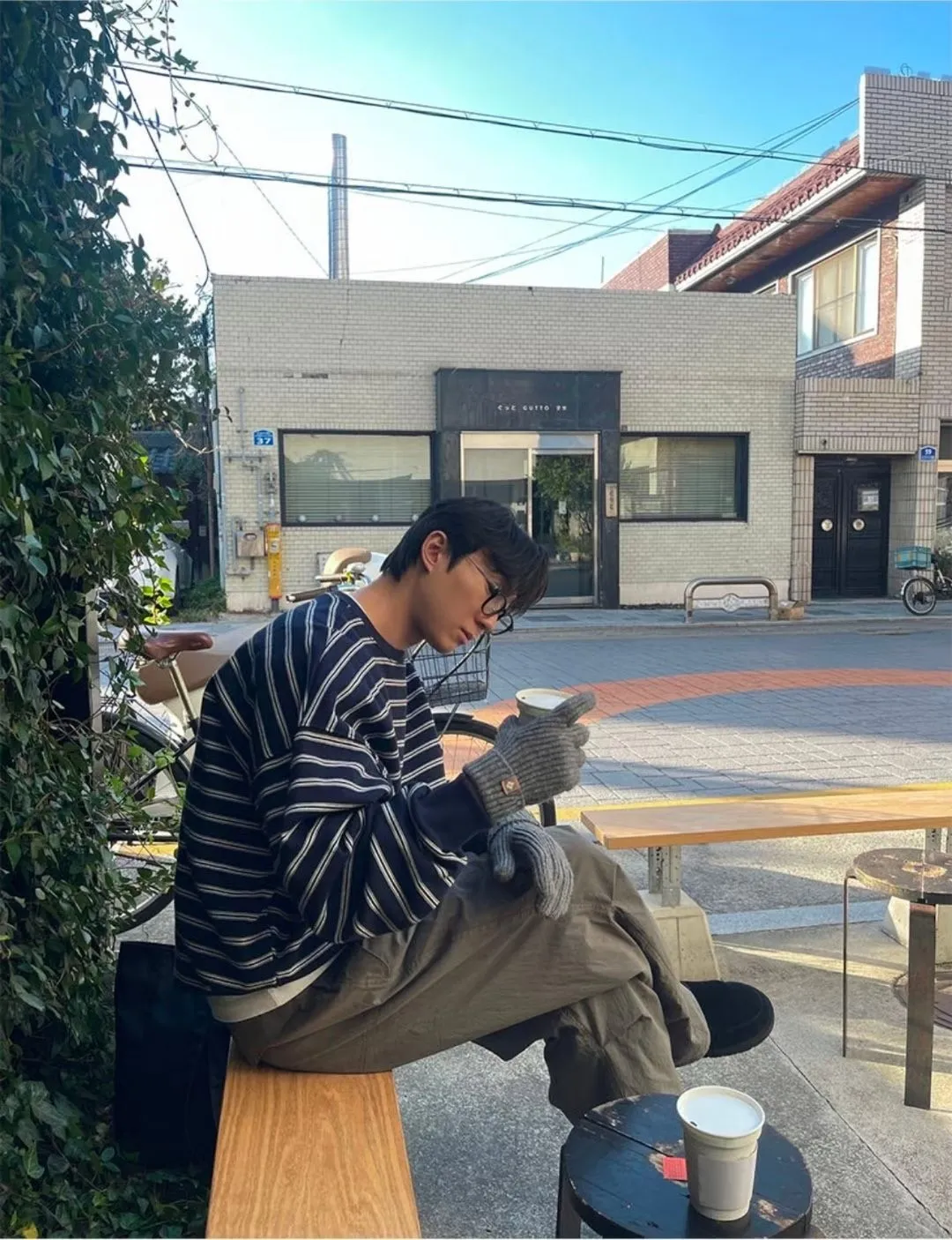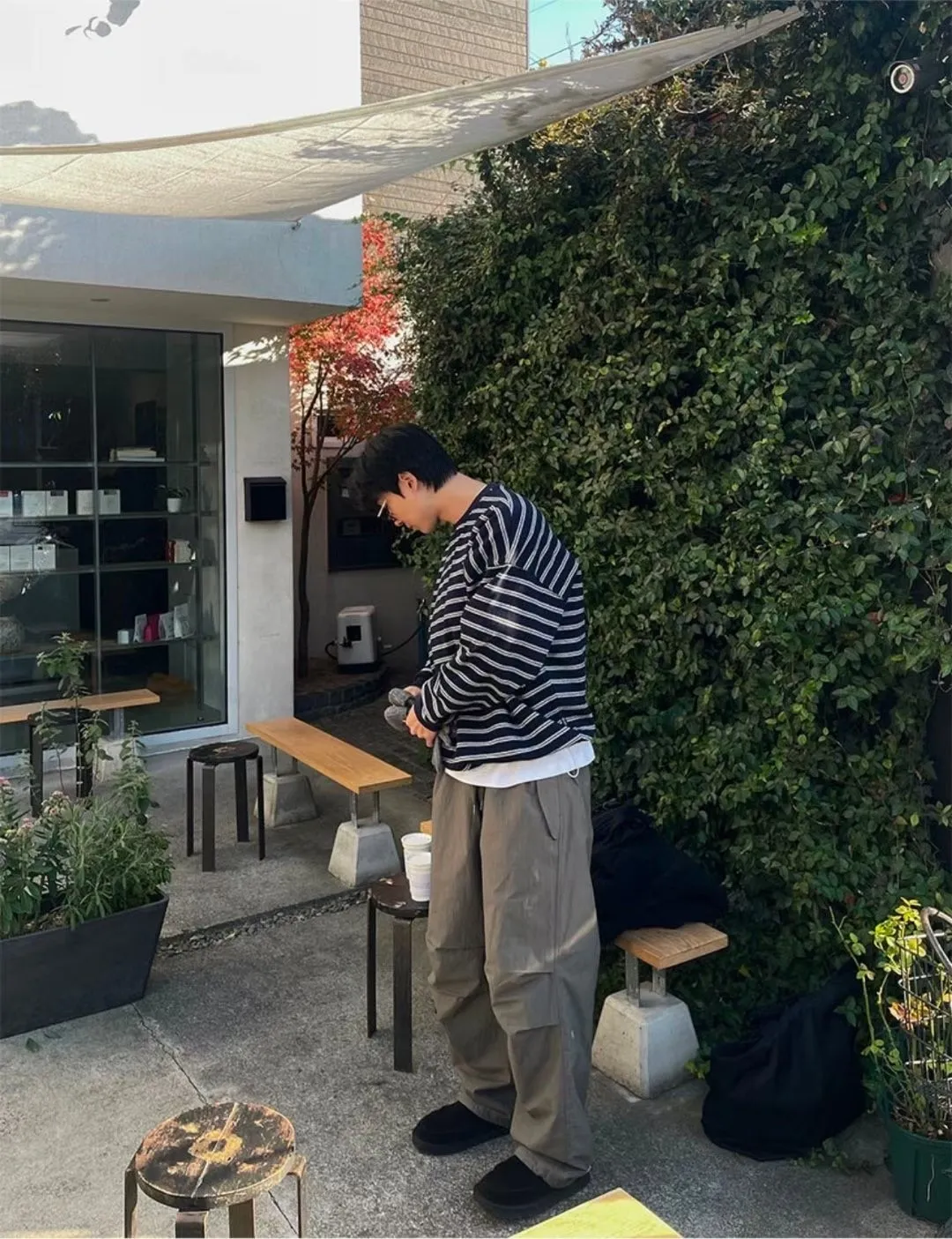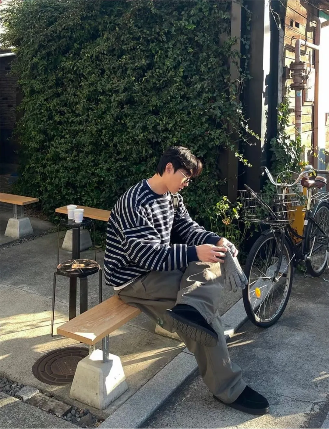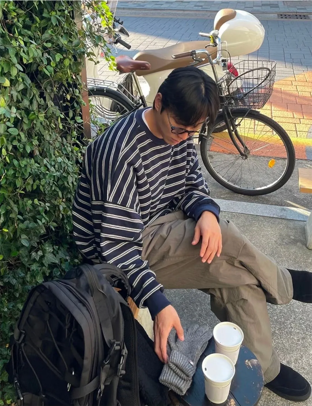 條紋抽繩刷毛上衣