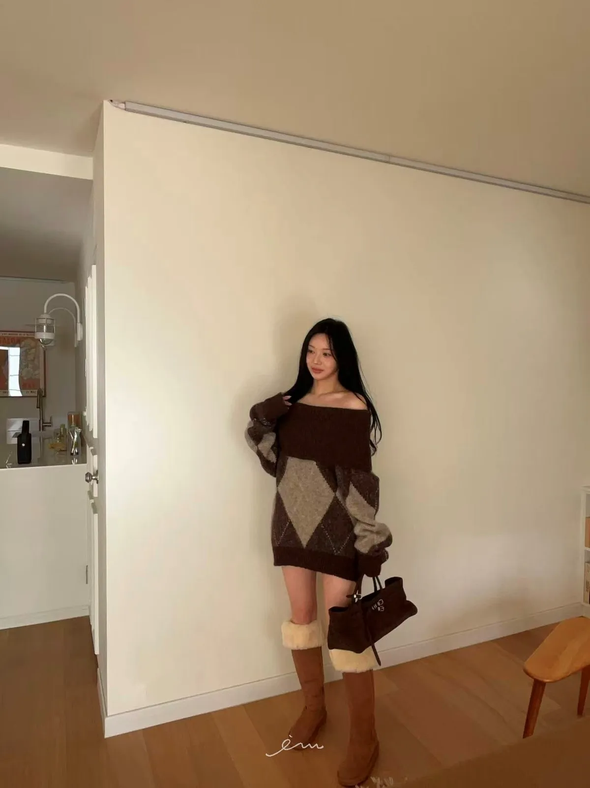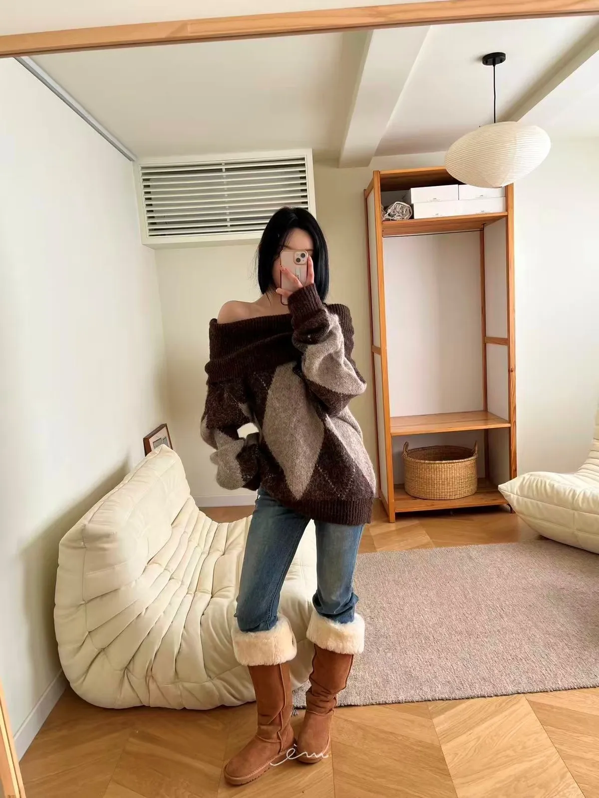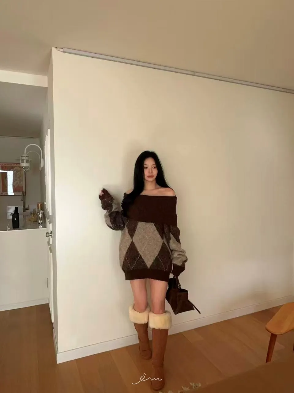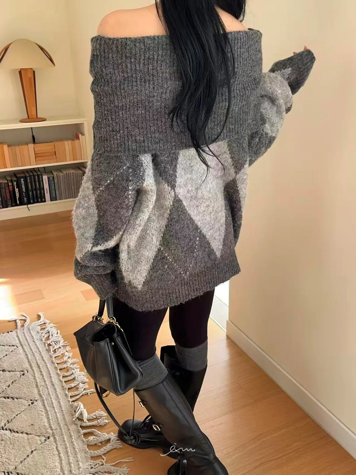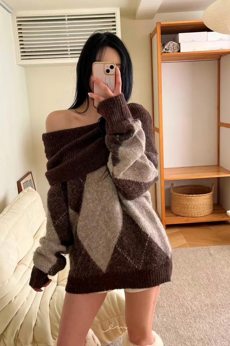 BAI格菱紋羊毛針織一字領