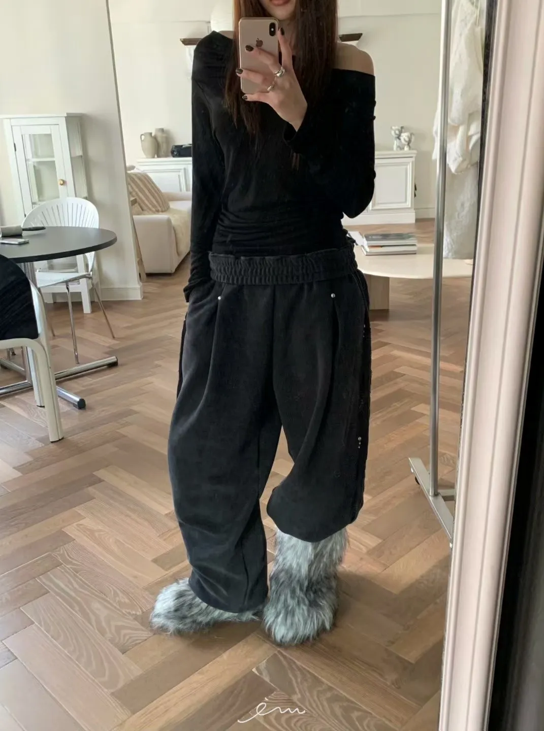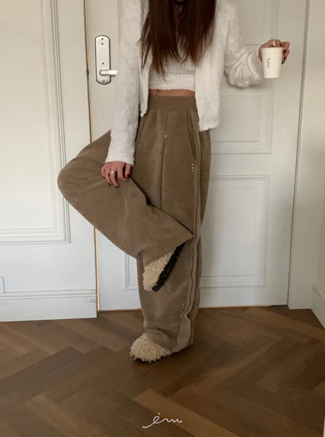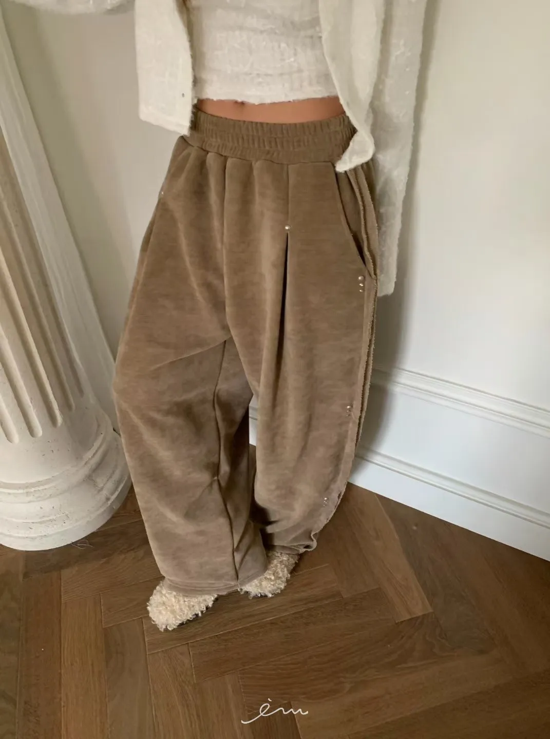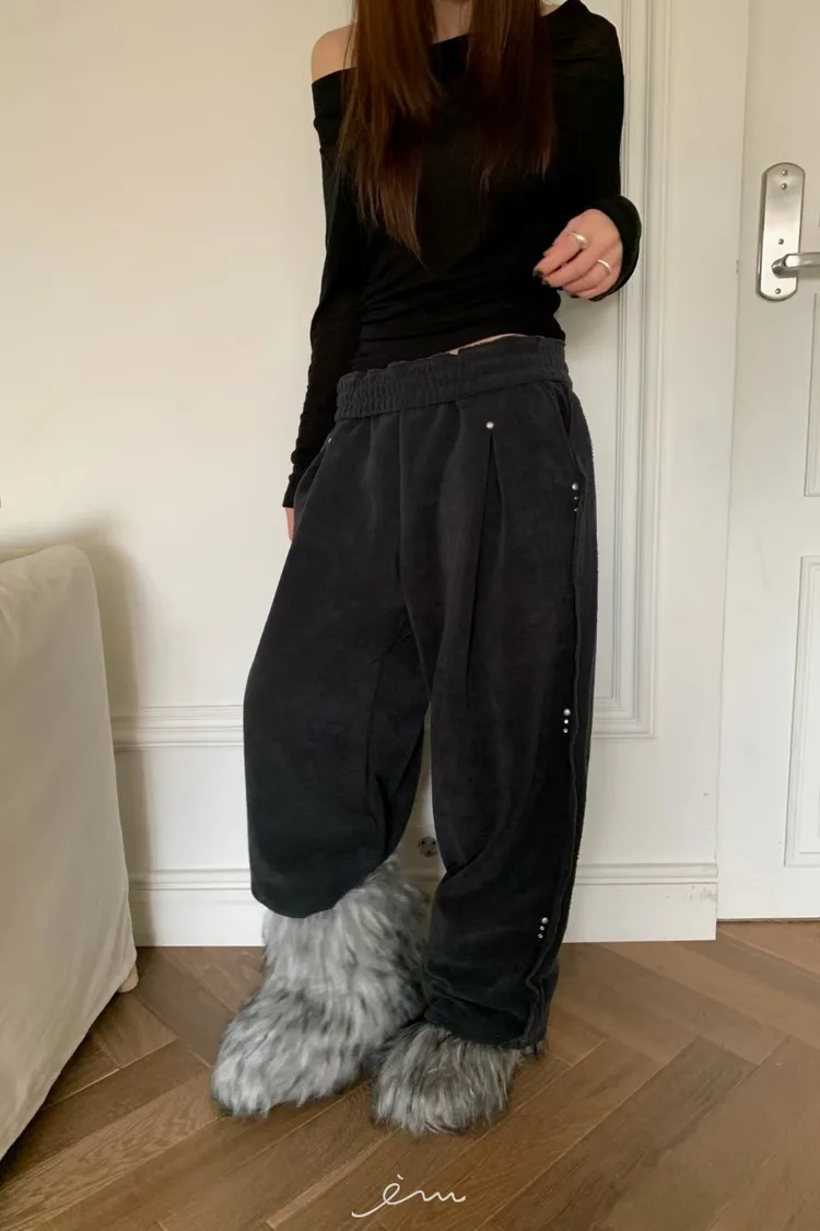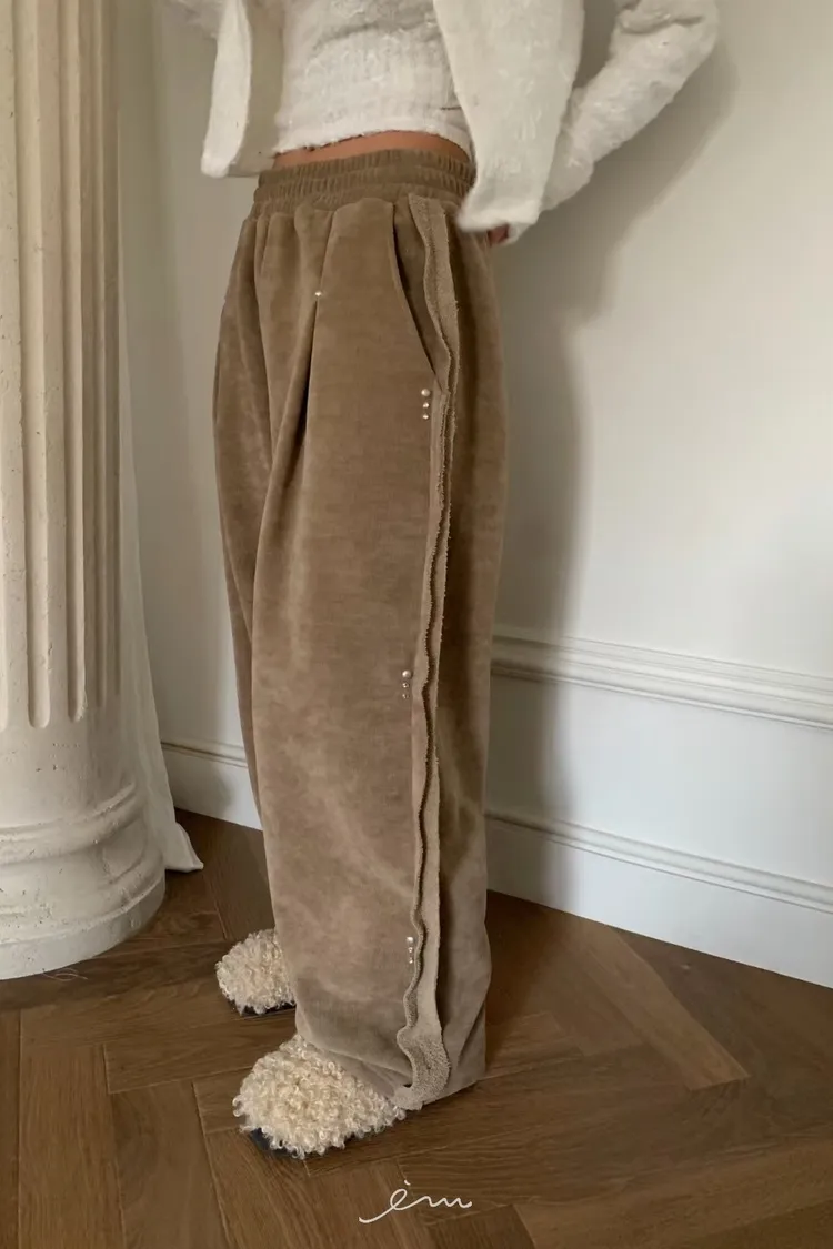 BE側釘珠造型絨料鬆緊長褲