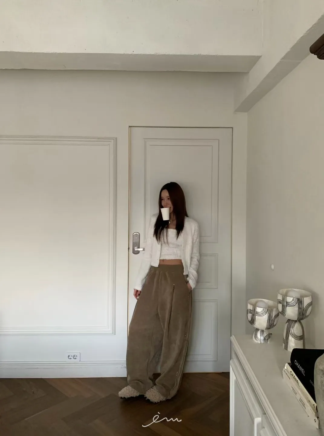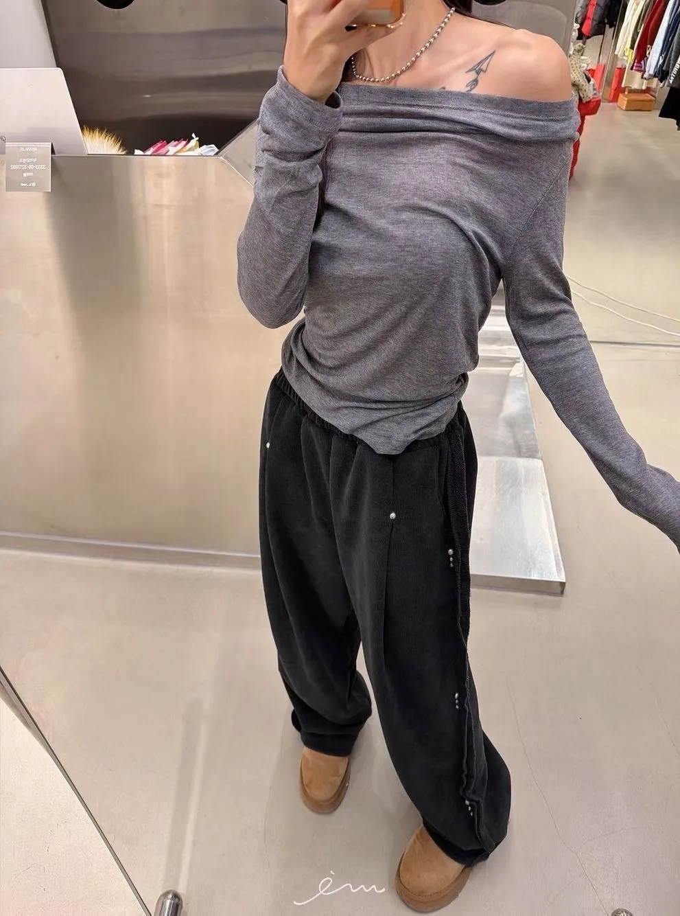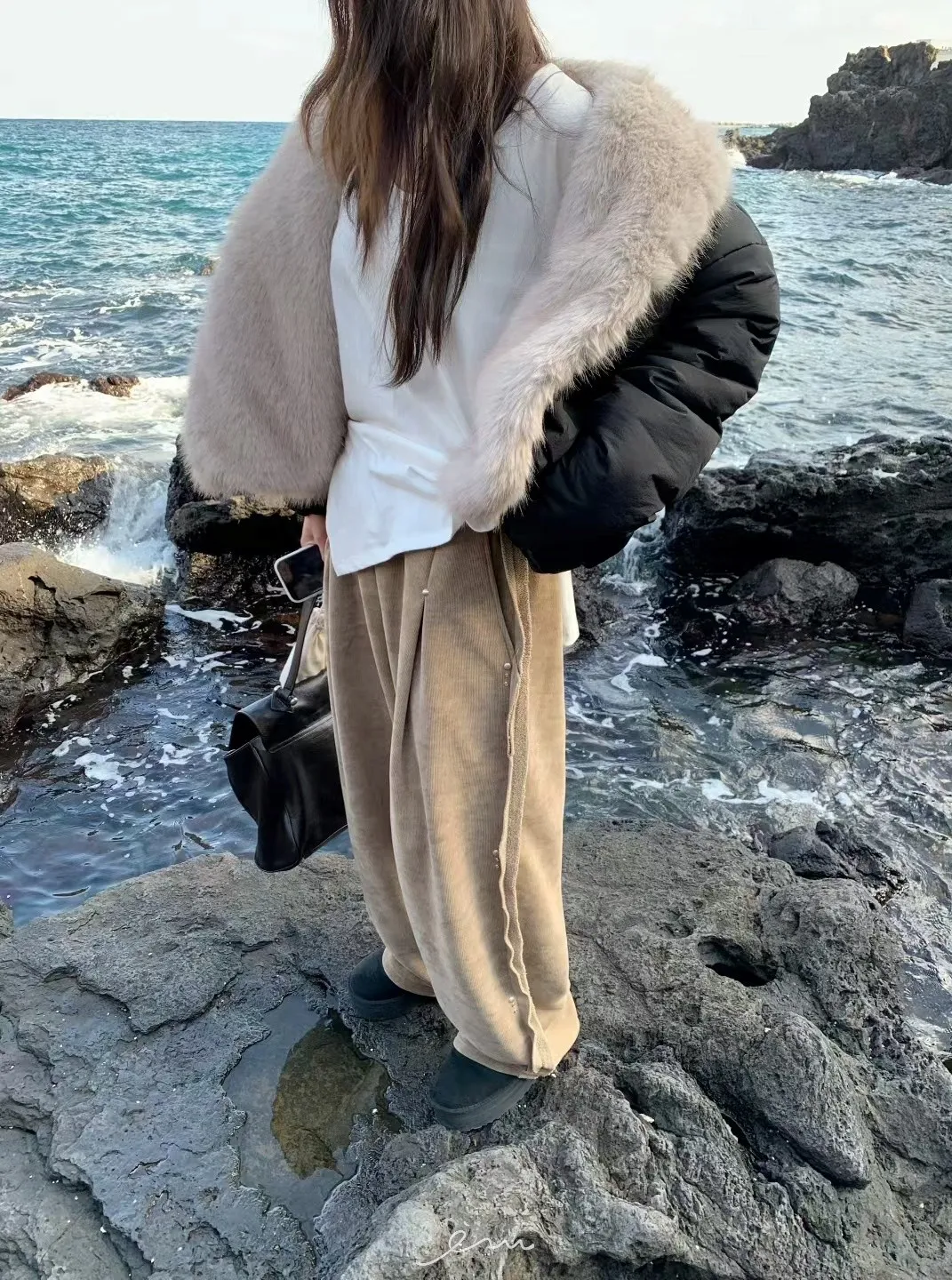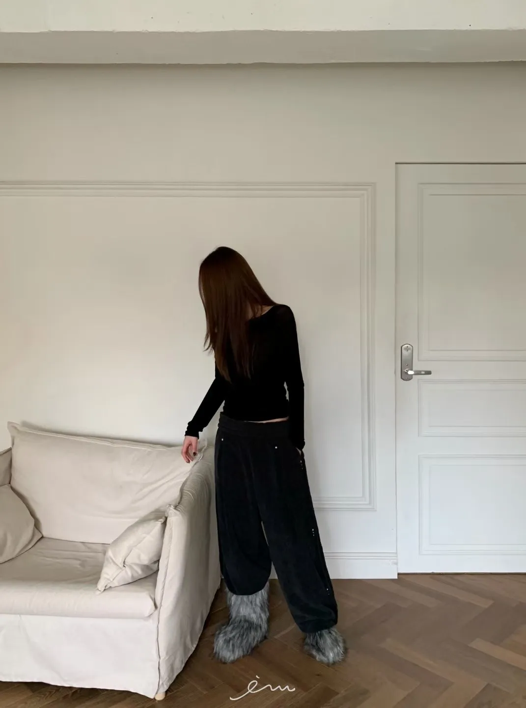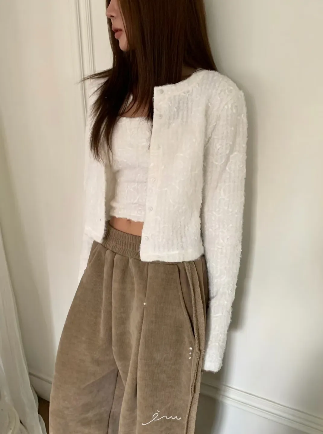 BE側釘珠造型絨料鬆緊長褲