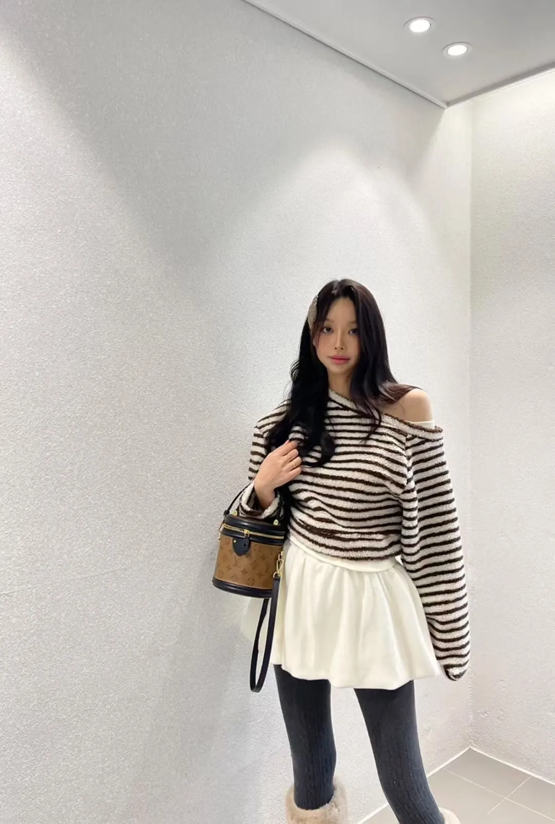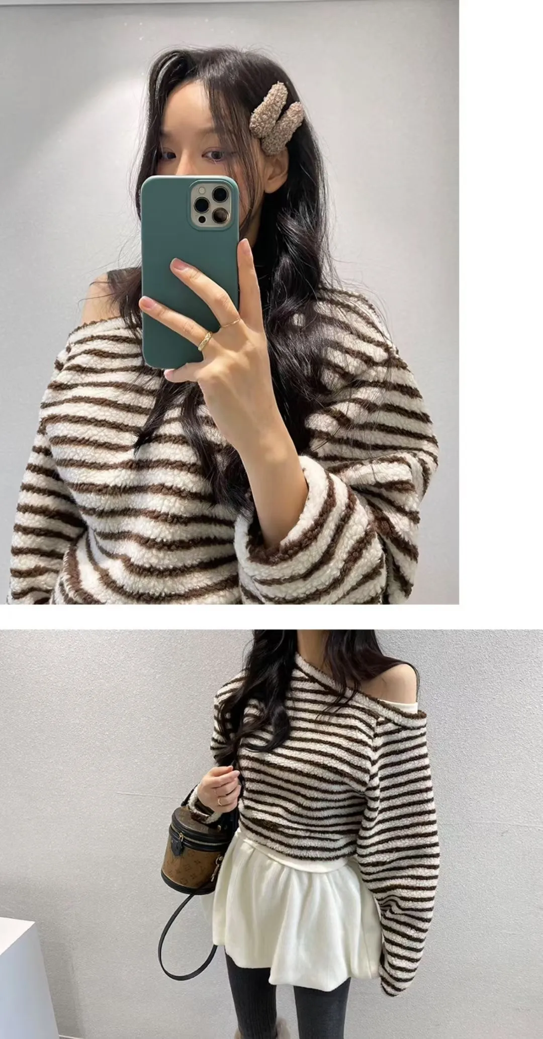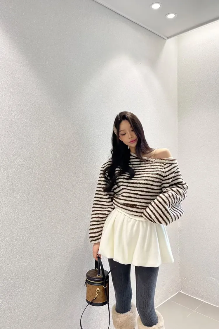 斜肩假兩件條紋上衣