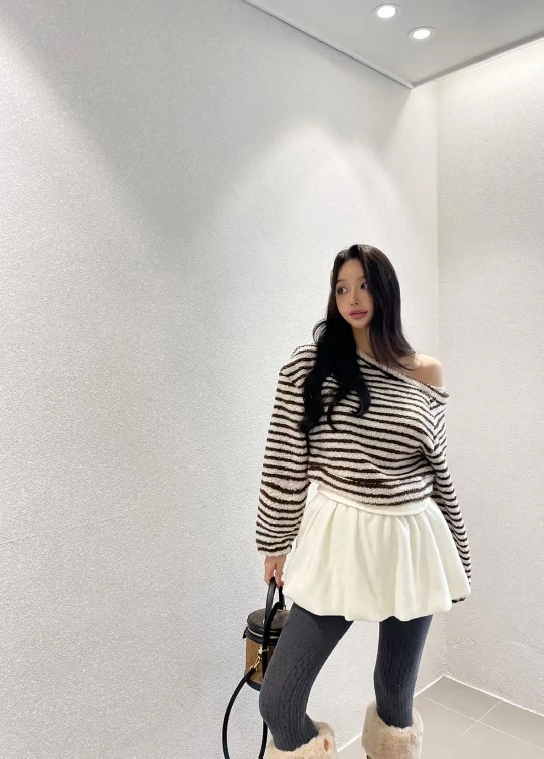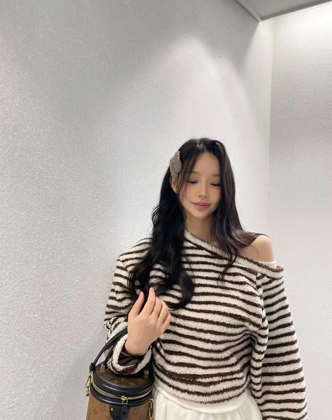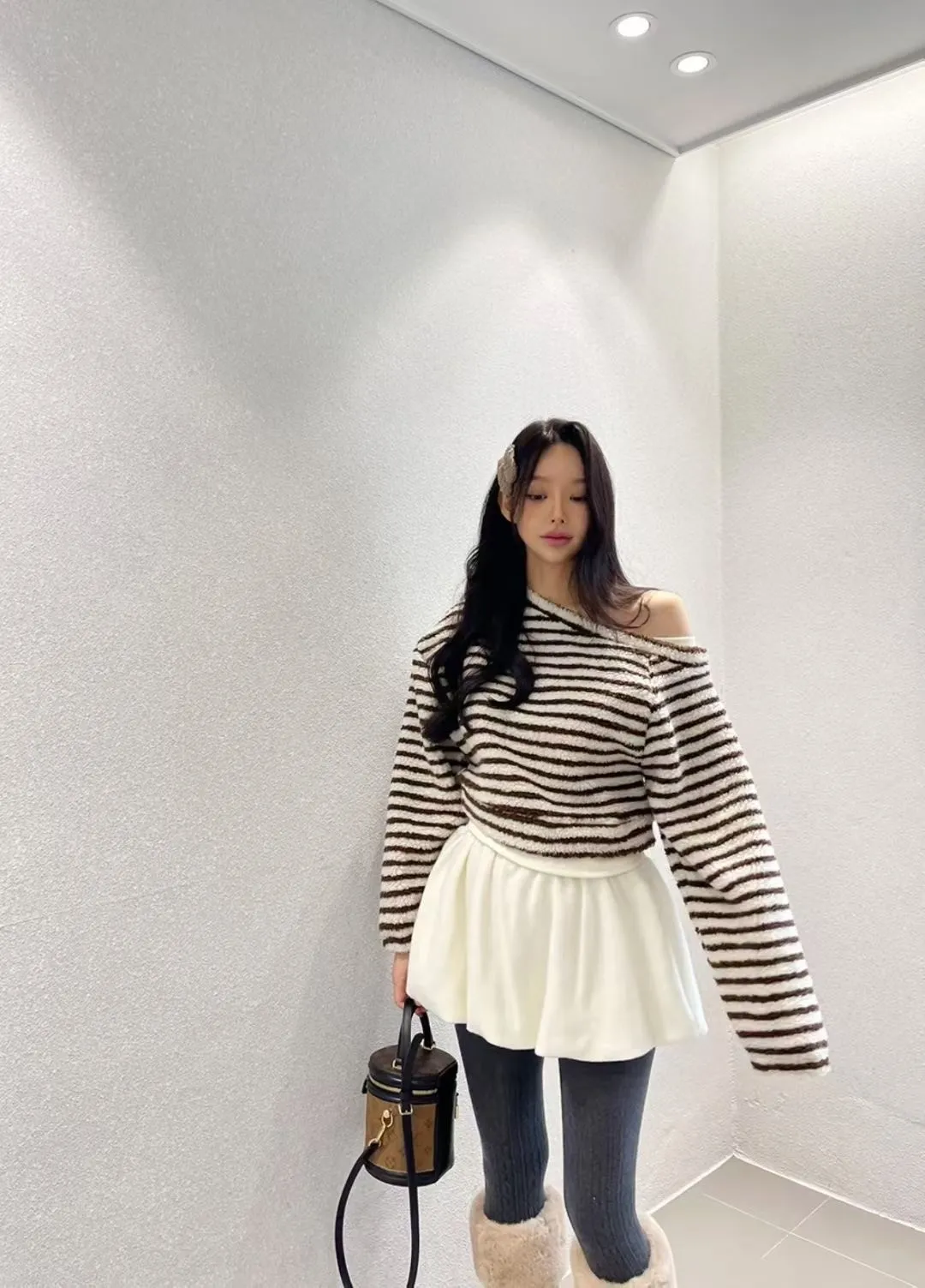 斜肩假兩件條紋上衣