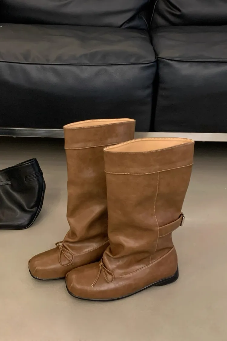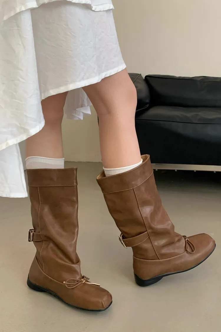 真皮蝴蝶結娃娃鞋接長靴(版偏小)